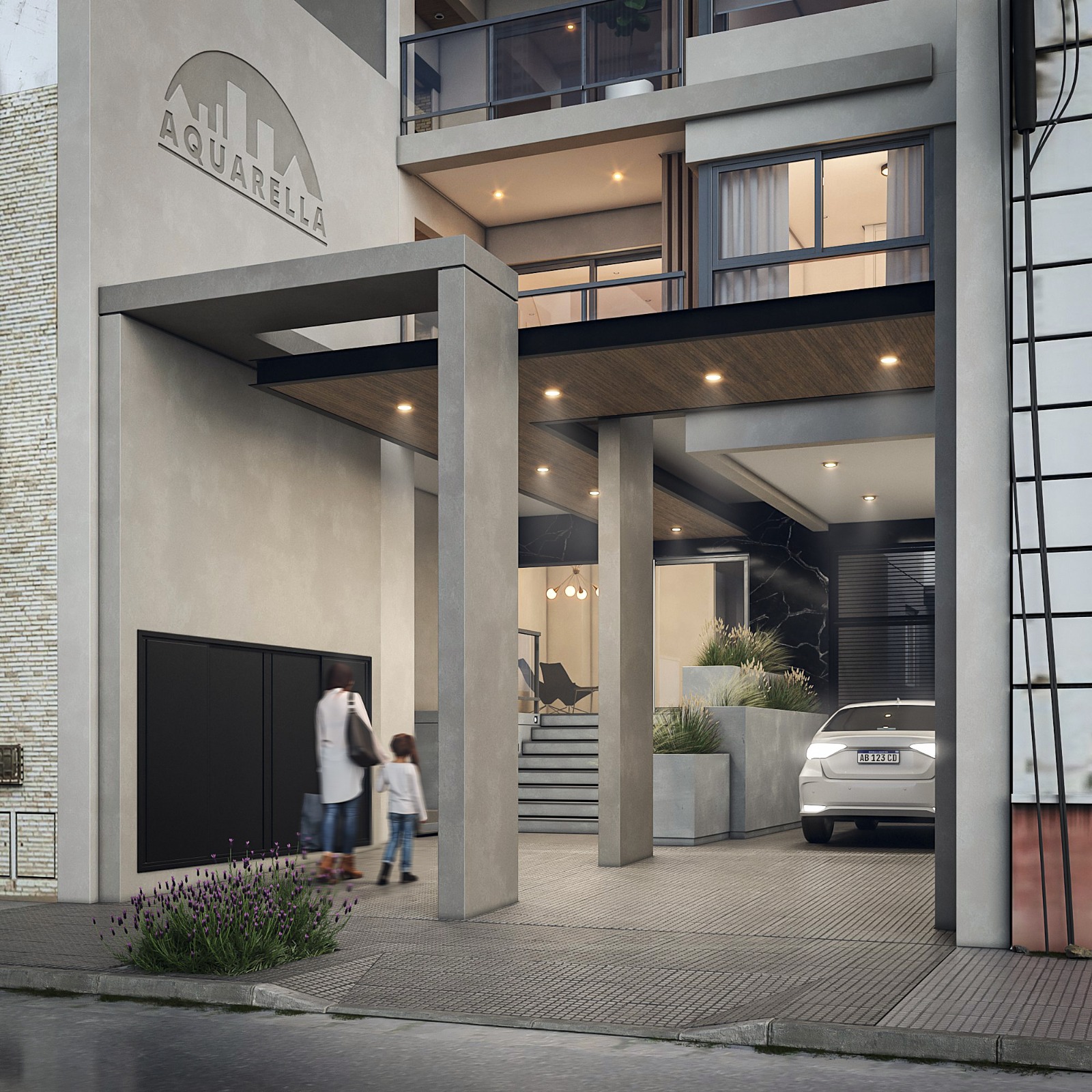 Los volúmenes se organizaron con el fin de contener un total de treinta y tres unidades de uno, dos y tres ambientes, distribuidos entre el primero y el décimo primer piso. Otra decisión del proyecto fue liberar de viviendas la planta baja del edificio, lo que permitió alojar los accesos peatonales y vehiculares a través de un retiro de cinco metros desde la LM, y generar una tridimension que actúa como transición entre el espacio urbano (publico) y el edificio (espacio privado). La continuidad material del solado de la vereda, refuerza esta idea.