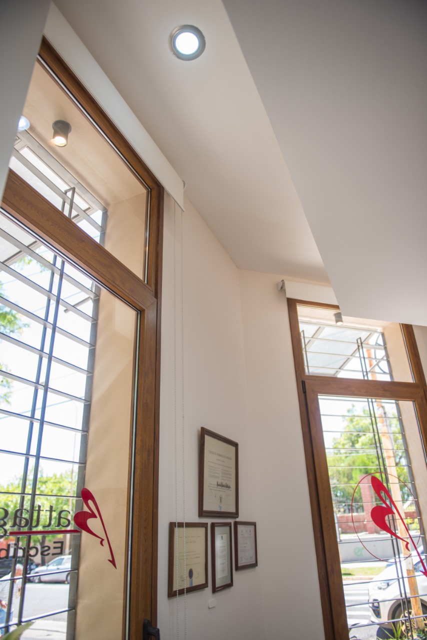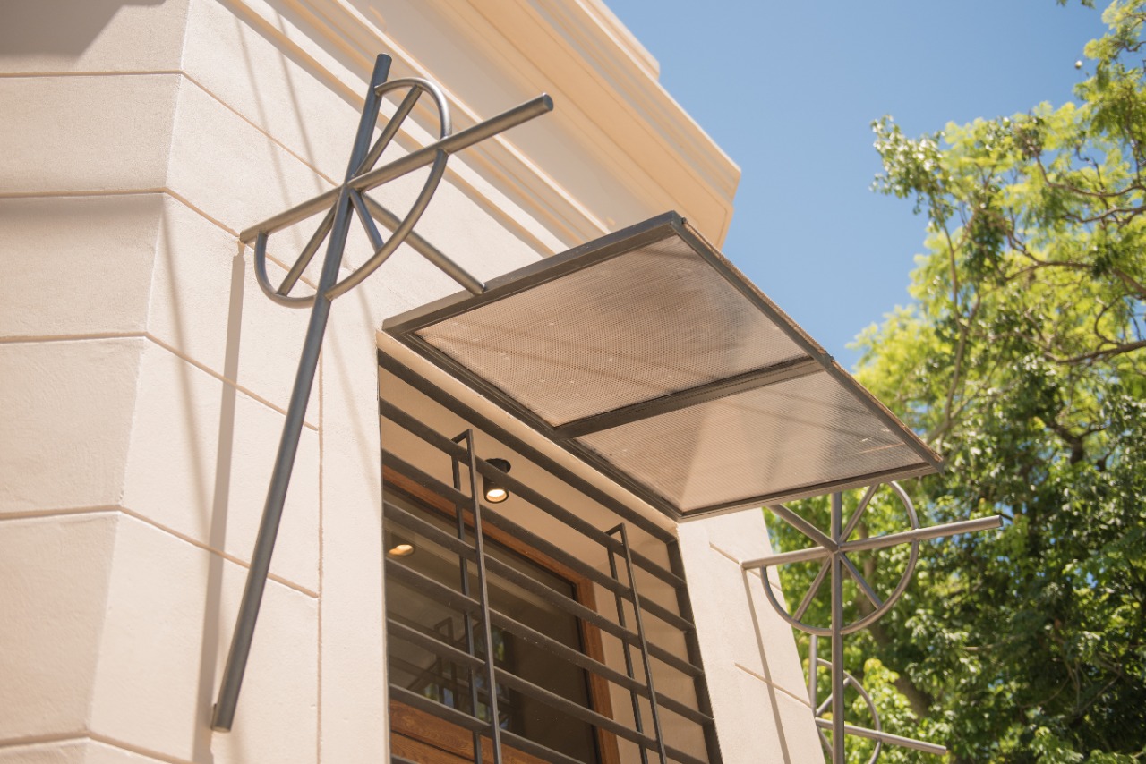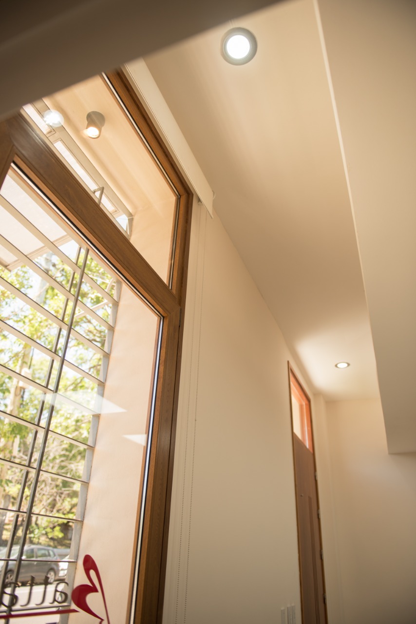 La intervención contempla el reemplazo de las aberturas (pero manteniendo los vanos originales), utilizando ventanas de pvc, doble vidriado hermético y la puerta de ingreso de madera maciza. A su vez, en cada abertura se destaca la presencia de aleros metálicos con policarbonato para proteger las mismas.